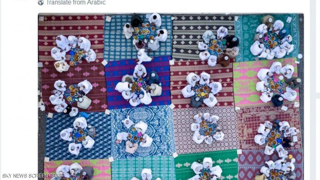 ويظهر التعليق المكتوب على تدوينة المصور العماني “يوسف الشعيلي” أنه من التقط الصورة، وأن الصورة، كانت بمناسبة إفطار عائلي، حيث كتب الشعيلي في حسابه على تويتر تحت الصورة “الإفطار الجماعي لشباب العائلة – بس من فوق”.